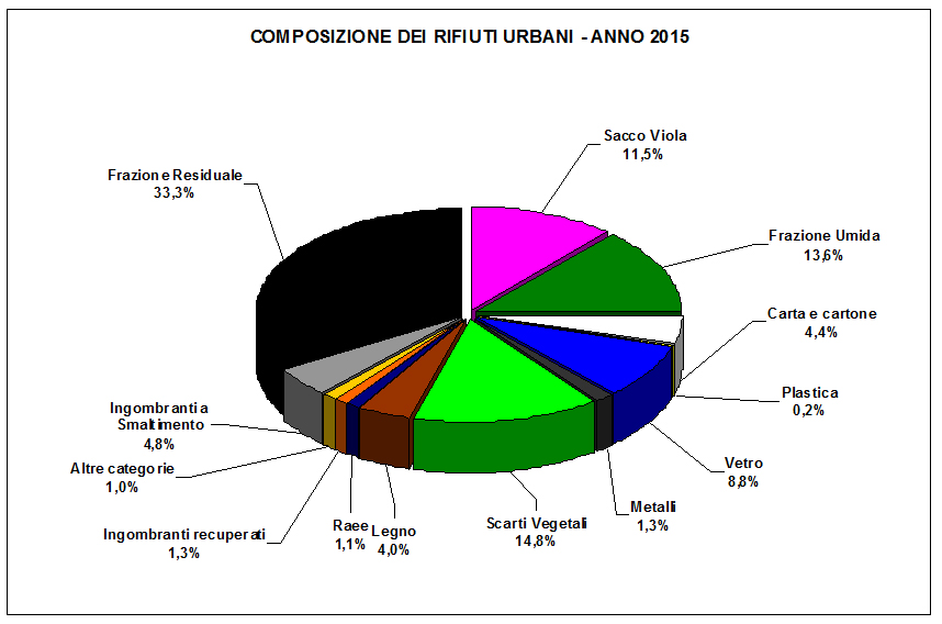 Anche la raccolta differenziata nel 2015 ha subito un leggero calo in termini assoluti toccando le 93,6 mila tonnellate (-412 t) ma è cresciuta in termini percentuali sul totale dei rifiuti raccolti, raggiungendo il 61,9% (+1,1% sul 2014).