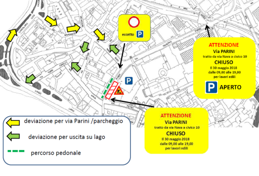 Durante il periodo di chiusura sarà comunque garantito l’utilizzo del parcheggio pubblico di via Parini, che resterà raggiungibile da via Nino Bixio e dalla parte alta di via Parini; il traffico proveniente dal lungolago e diretto in via Parini sarà deviato sulle vie Malpensata e Bixio, mente i veicoli in uscita dal parcheggio a pagamento di via Nava, potranno raggiungere il lungolago passando da via Torri Tarelli.