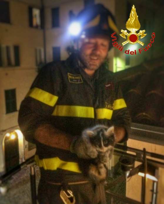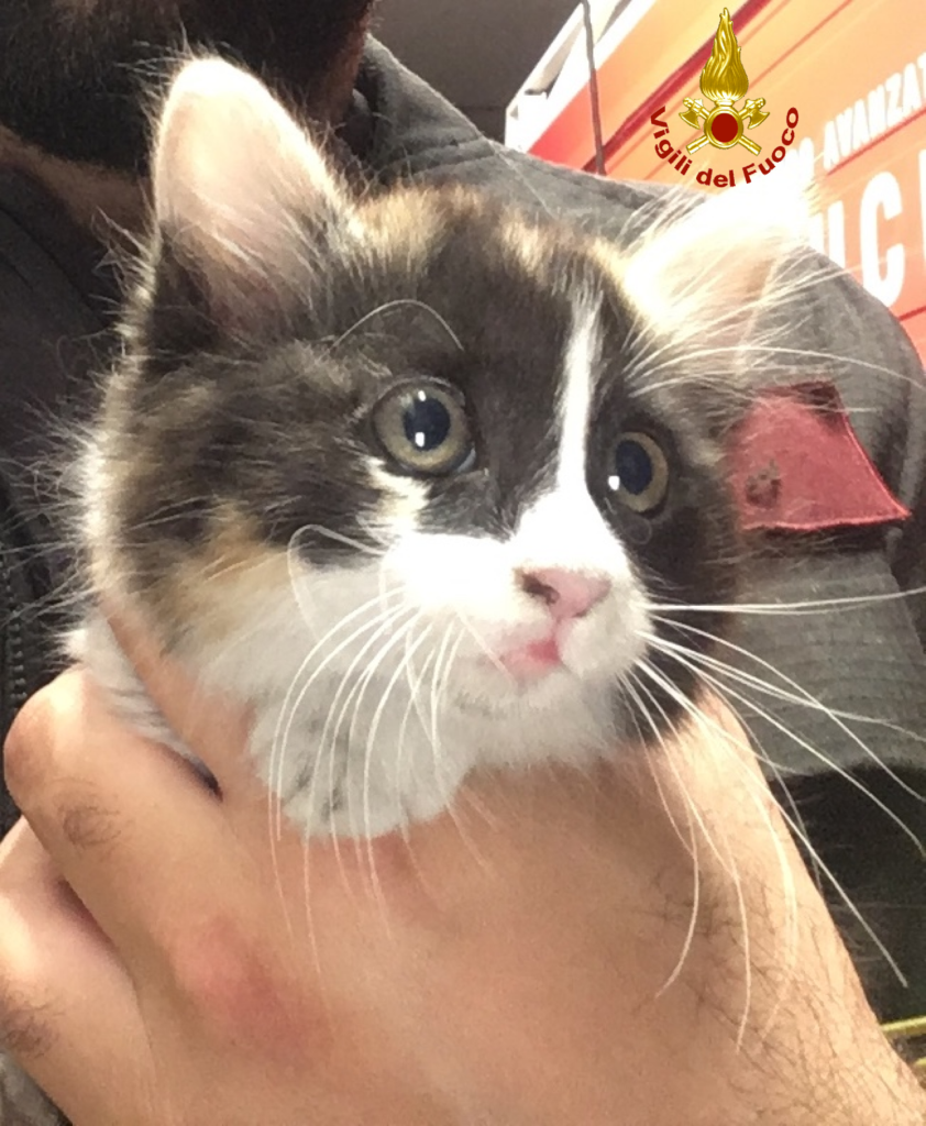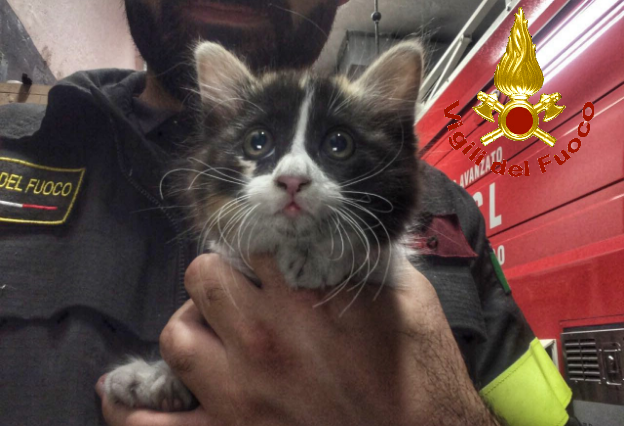 Dopo il recupero, i Vigili del Fuoco hanno accolto il micino nella loro caserma, per poi affidarlo in giornata ad una volontaria della protezione animali.