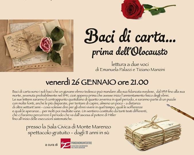 MONTE MARENZO – In occasione della giornata della memoria la biblioteca propone la lettura a due voci “Baci di carta… Prima dell’Olocausto” a cura di Pandemonium teatro di Bergamo.
