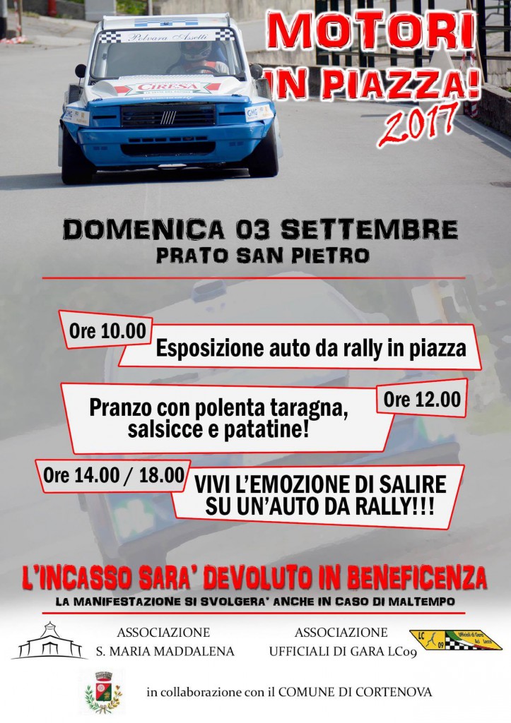 Appuntamento per gli appassionati di motori a Cortenova (Prato San Pietro) Domenica 3 Settembre: l’Associazione Santa Maria Maddalena di Prato San Pietro, in collaborazione con l’Associazione Commissari di Percorso LC09 di Lecco e con il Patrocinio del Comune di Cortenova organizzano infatti una giornata a scopo benefico.
