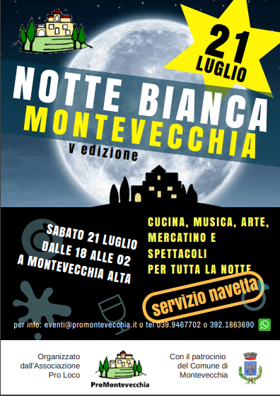La musica accompagnerà i partecipanti fino alle 2 del mattino così come le degustazioni dell’ottimo cibo preparato dai ristoratori locali, sarà possibile partecipare con esperti a visite guidate del bellissimo Santuario della Beata Vergine e di Villa Agnesi, ammirare il panorama notturno dall’alto del colle l’immancabile mercatino composto da bancarelle con i produttori locali di abili hobbisti e artigiani, le mostre di quadri dei pittori locali. La serata avrà diversi momenti di spettacolo per grandi e bambini.