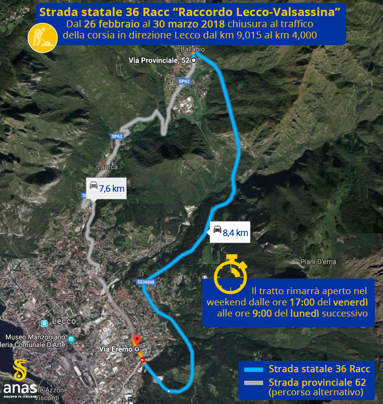 La chiusura non riguarderà i weekend ( verrà rimossa dalle 17.00 del venerdì alle ore 9.00 del lunedì e in qualunque caso si verificasse il blocco del traffico lungo la viabilità alternativa). Lungo la corsia sud, a scendere verso il capoluogo, il traffico verrà dunque deviato lungo la Sp 62 – la vecchia Lecco-Ballabio – con possibilità di immissione nella strada statale da via dell’Eremo.