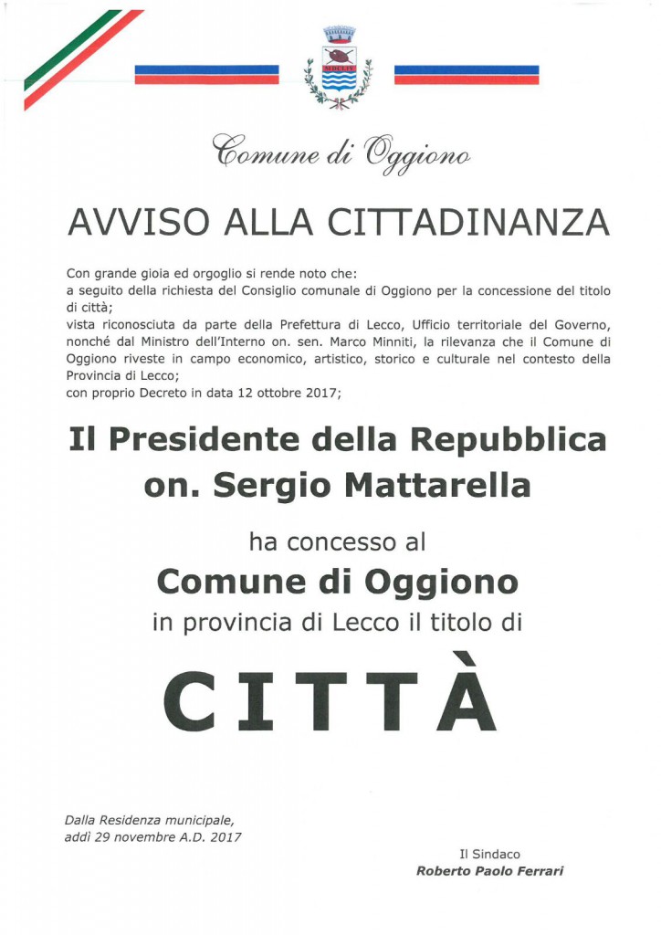 OGGIONO – È stato firmato il 12 ottobre il decreto del Presidente della Repubblica on. Sergio Mattarella con cui al Comune di Oggiono è stato concesso il titolo onorifico di “Città”.