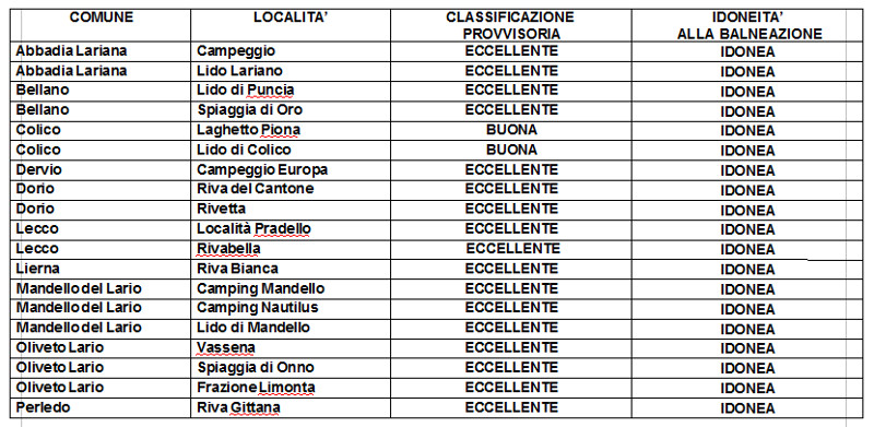 LECCO – Dei 19 punti di balneazione del nostro lago di competenza dell’Asl della Provincia di Lecco per quanto concerne i campionamenti e le relative analisi  effettuate tramite il Servizio Igiene e Sanità Pubblica ed il Laboratorio di Prevenzione del Dipartimento di Prevenzione Medica, tutt e 19 hanno dato un buon esito con 17 località classificate in modo “eccellente” e due in modo “buono” ovvero il Laghetto di Piona e il Lido di Colico.