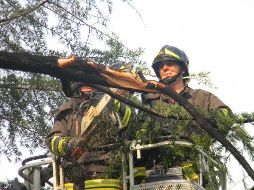 LECCO – Vigili del Fuoco al lavoro di buon mattino con gru e motosega in via Caldone nel rione di Olate. Tutta colpa del forte vento che ha accompagnato il temporale mattutino la cui violenza ha spezzato alcuni grossi rami din un grande albero, alto circa 25 metri, situato nel giardino della scuola Maria Ausiliatrice.