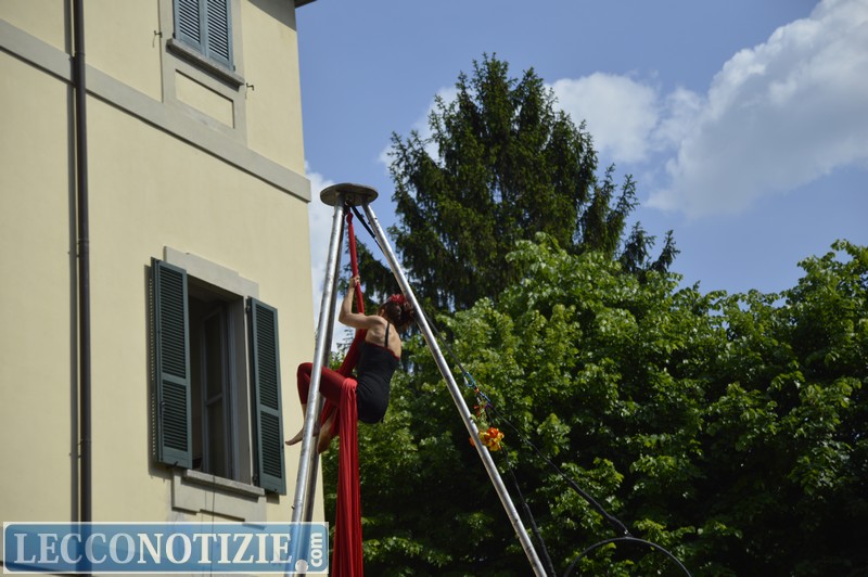 Nel giardino di Villa Sirtori moltissimi adulti e bambini si sono ritrovati con il naso all’in sù, incantati dalle straordinarie evoluzioni, su cerchio e tessuti sospesi a mezz’aria, che l’artista Chiara Vitale ha proposto nel suo spettacolo “Chiara in Champagne”.