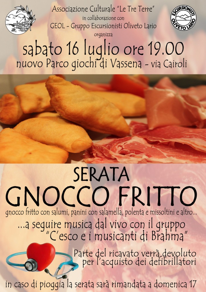 gnocco_16 copyOLIVETO –  Anche quest’anno l’Associazione culturale Le Tre Terre di Oliveto Lario organizzerà una serata, sabato 16 luglio, dedicata alla degustazione dello “gnocco fritto con salumi” e di piatti più tipici della tradizione locale quali panino con la salamella e polenta e missoltini.