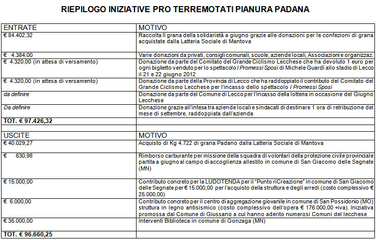 Inoltre sono ancora da definire le donazioni da parte del Comune di Lecco per l’incasso della lotteria in occasione del Giugno Lecchese e quelle che giungerà dall’intesa tra aziende locali e sindacati di destinare ai terremotati 1 ora di retribuzione del mese di settembre, raddoppiata dall’azienda.