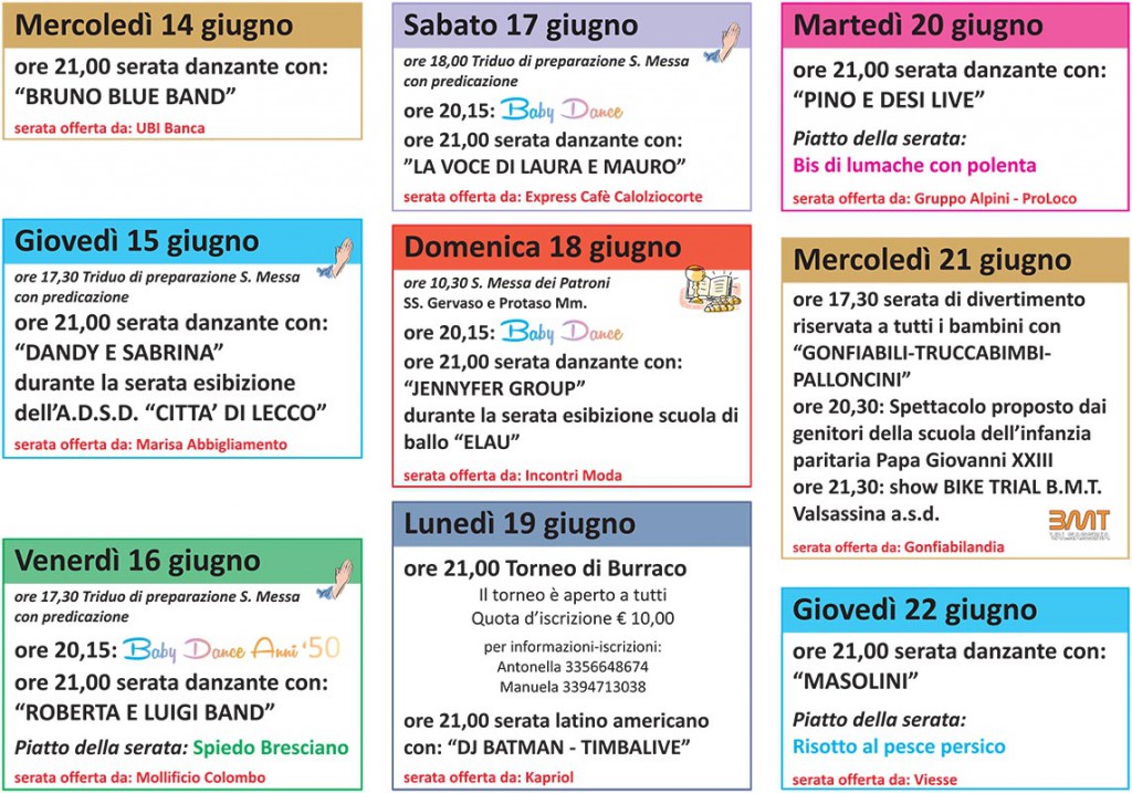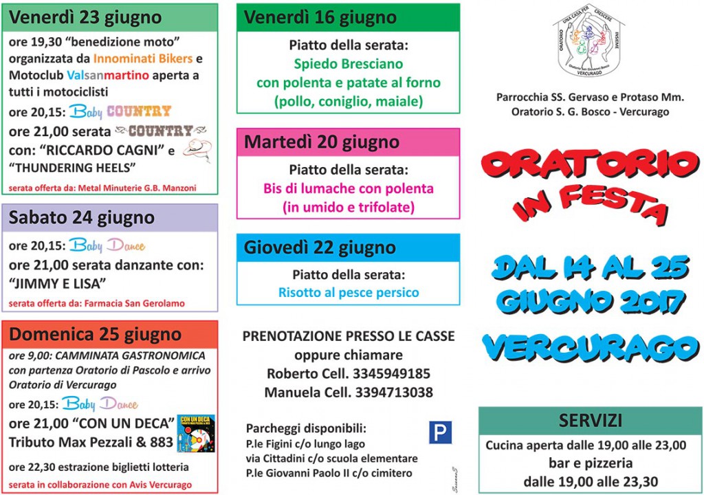 VERCURAGO – Dal 14 al 25 Vercurago si ritrova per serate all’insegna della buona cucina, musica e giochi: torna anche quest’anno “Oratorio in Festa” organizzata dalla Parrocchia SS. Gervaso e Protaso e dall’Oratorio San Giovanni Bosco.