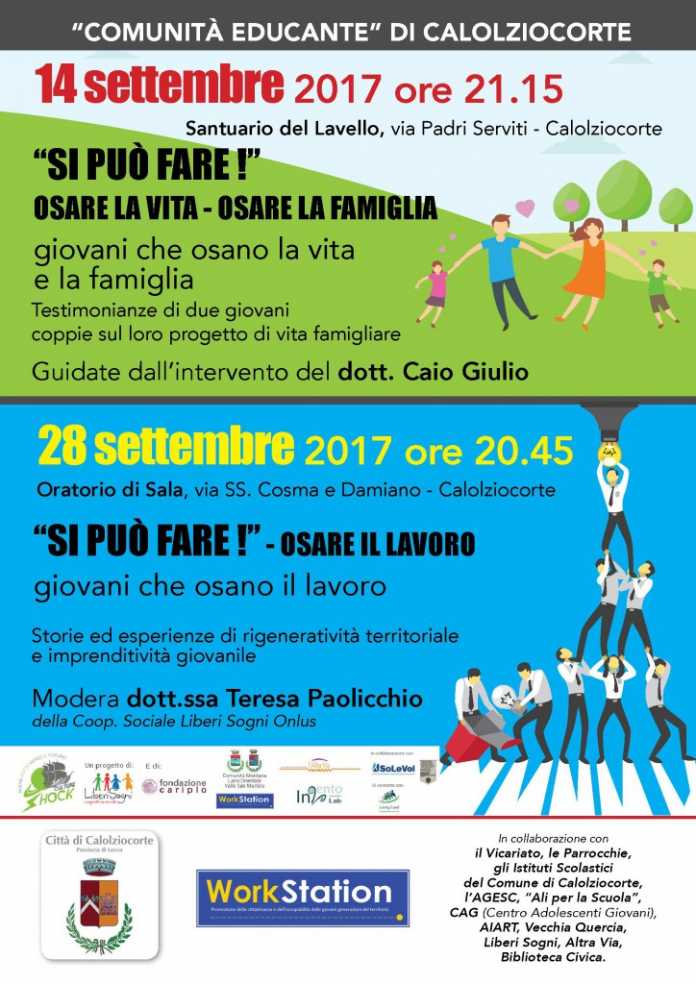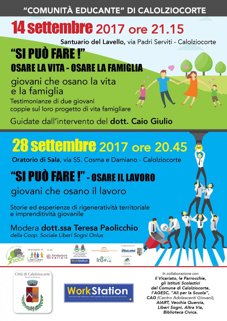 CALOLZIO – La Comunità Educante di Calolziocorte dopo la riuscita della prima serata al Lavello “Si può fare! Osare la vita – la famiglia”, sul tema dei giovani con famiglia durante la quale sono emerse interessanti riflessioni, con l’entusiasmo e la soddisfazione di tutti i partecipanti, propone la seconda serata, in programma per giovedì 28 settembre.
