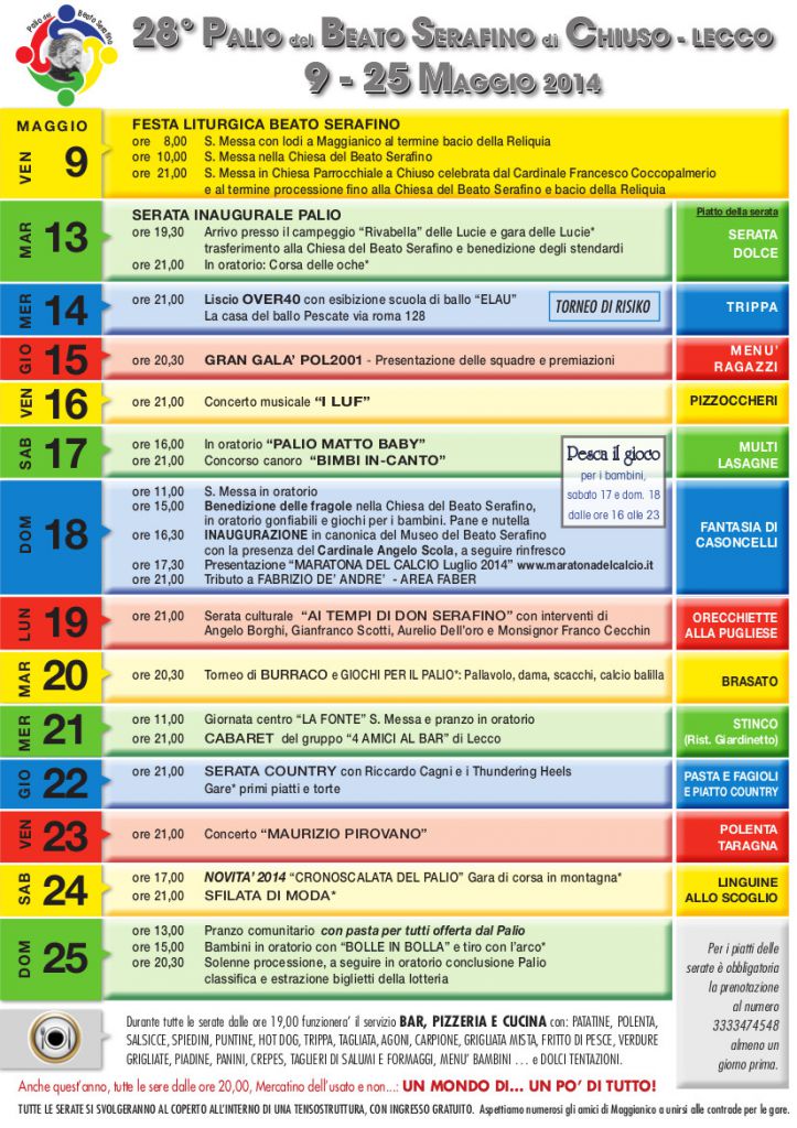 LECCO – Tutto pronto per la 28^ edizione del Palio del beato Serafino di Chiuso. Martedì 12, infatti, alle 19, a Pescate, in corrispondenza della canottieri, una delegazione delle 4 contrade del rione di Chiuso: Morazzone (Rossa), Molini (Blu), Corso Bergamo (Gialla) e Chiuso Vecchio (Verde) insieme ai sacerdoti dell’unità pastorale di Maggianico e Chiuso, don Adriano e don Franco saliranno sulle 4 Lucie messe gentilmente a disposizione dai comuni di Pescate, Garlate, Olginate e Vercurago.