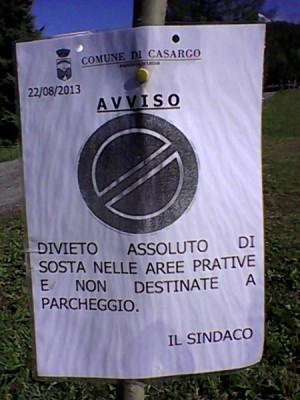 CASARGO – Detto, fatto. Il sindaco di Casargo Pina Scarpa ha mantenuto la parola intervenendo sul problema parcheggi all’Alpe Paglio facendo affiggere un divieto assoluto di parcheggiare le auto sul prato antistante il posteggio.