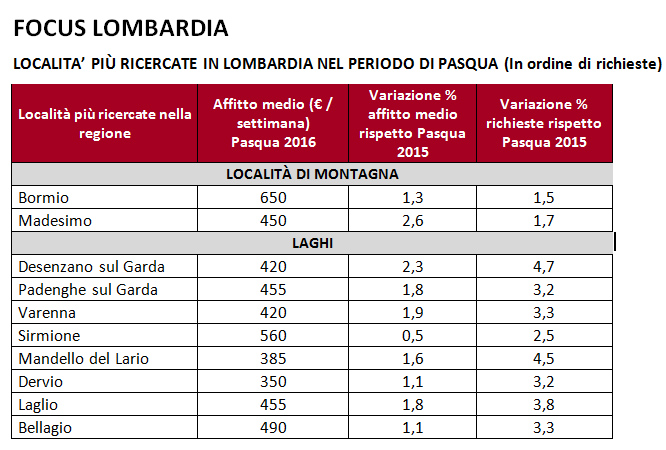 Sui laghi lombardi, tra le località più gettonate troviamo alla guida le bresciane Desenzano del Garda (420€) e Padenghe del Garda (455€), che, rispetto a Pasqua 2015, hanno registrato rispettivamente ben il +4,7% di richieste e il +3,2%.