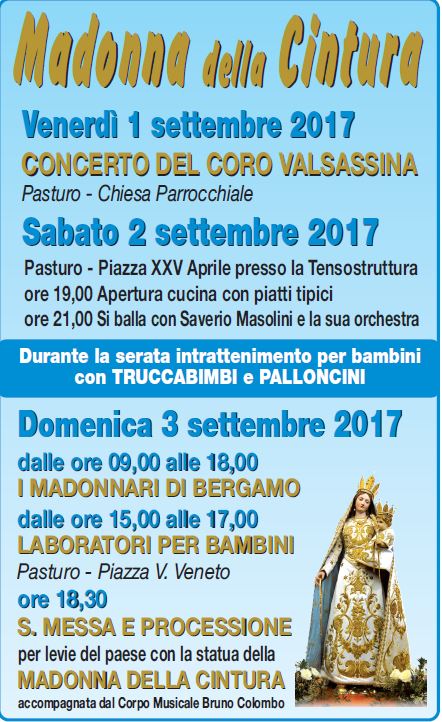 PASTURO – E’ tutto pronto per la festa della Madonna della Cintura che animerà le vie di Pasturo dall’1 al 3 settembre.