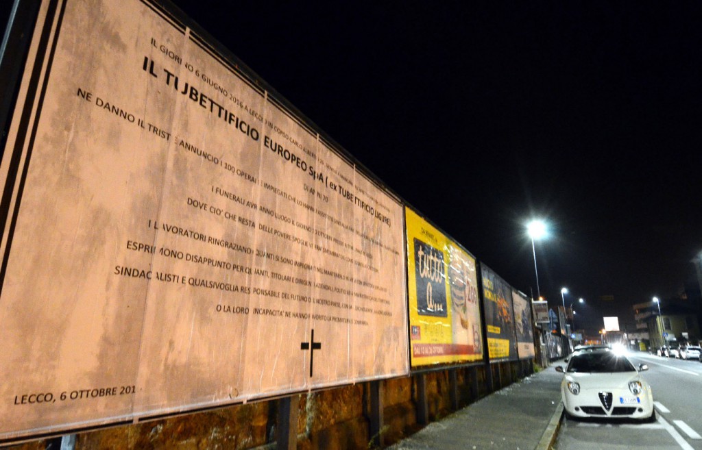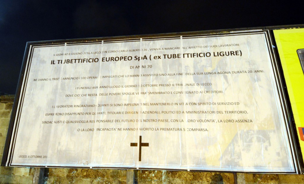 LECCO – Un manifesto funebre annuncia la “morte” del Tubettificio Europeo: un enorme necrologio apparso nelle vicinanze dell’ex fabbrica di lattine di Pescarenico, fallita nei mesi scorsi dopo lunghe settimane di crisi e trattative.