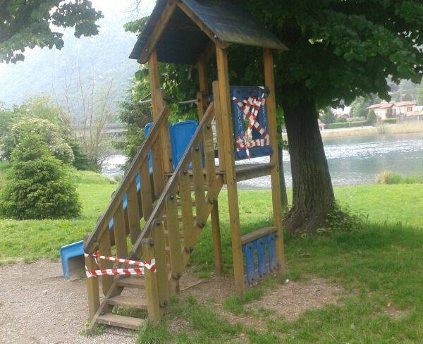LECCO – Transennato lo scivolo dei giardini del Bione. Nel parco dopo piazza Era la struttura per bambini è stata dichiarata inagibile.