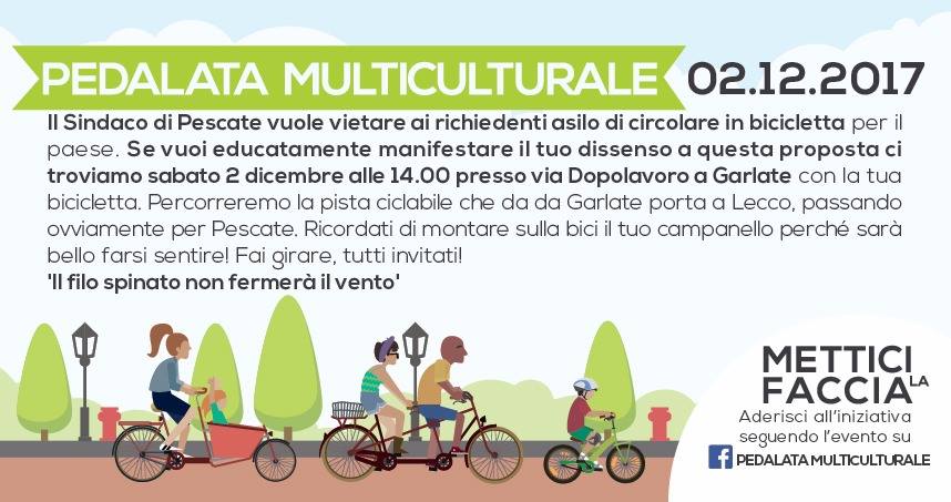 “Siamo ormai abituati alle pittoresche dichiarazioni del Sindaco di Pescate ma l’ultima ci ha davvero lasciati perplessi – hanno detto gli organizzatori -. Dante De Capitani vorrebbe vietare l’ingresso in paese ai richiedenti asilo solo per il fatto di inforcare una bicicletta. Le ragioni sembrano anche serie: una povera ragazza è rimasta coinvolta in un incidente con un richiedente asilo, in torto e nullatenente, e ora si trova con un conto salato da pagare. Esprimiamo la nostra piena solidarietà alla povera incidentata ma non capiamo la ragione per cui il divieto di accesso a Pescate non sarebbe esteso a tutti i nullatenenti ma solo ai ‘richiedenti asilo politico’. Chiediamo al Sindaco di ripensarci, di non attuare davvero quella che sarebbe un’ordinanza discriminante e per questo anticostituzionale. Intanto noi proviamo a riempire il suo paese di allegria, colori e storie organizzando una biciclettata multiculturale. E dato che vuole essere una giornata costruttiva promuoveremo una raccolta fondi per ripagare i danni subiti dal veicolo della povera ragazza. Tutti sono invitati a partecipare, grandi e piccoli, famiglie e single, tifosi del Milan o della Fiorentina, alti e bassi, richiedenti asilo e non”.