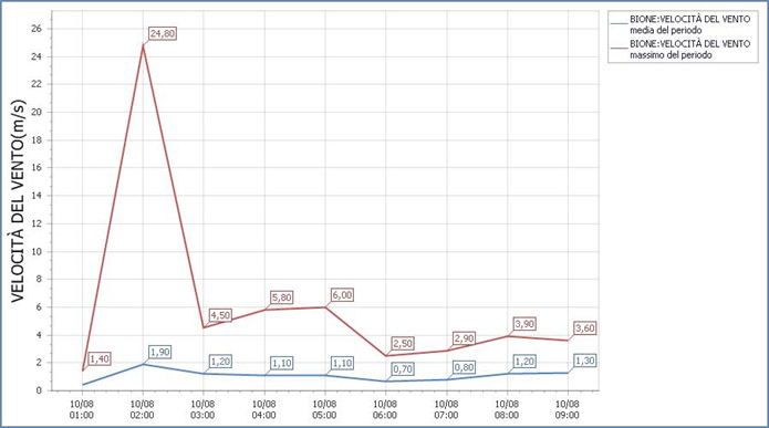 La forza del vento, intorno alle 2 della notte del 10 agosto, ha raggiunto circa i 90 km orari (24,8 m/s). Il tutto in pochissimi minuti ma sufficienti per creare danni stimati in circa 400 mila euro.