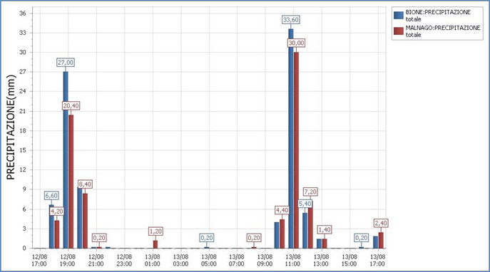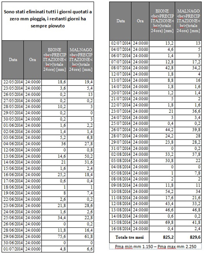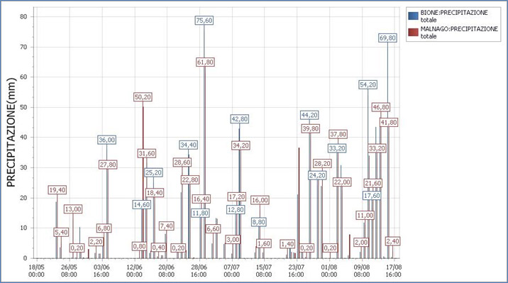 Nei circa tre mesi in esame dal personale della Protezione Civile (dal 22 maggio al 16 agosto) si sono avuti ben 59 giorni di precipitazioni e solo 24 di sole, per un totale di oltre 820 millimetri di pioggia caduti in città; un quantitativo impressionante se pensiamo che in un intero anno a Lecco si registra una media che va da un minimo di 1.150 millimetri ad un massimo di 2.250 mm di pioggia.