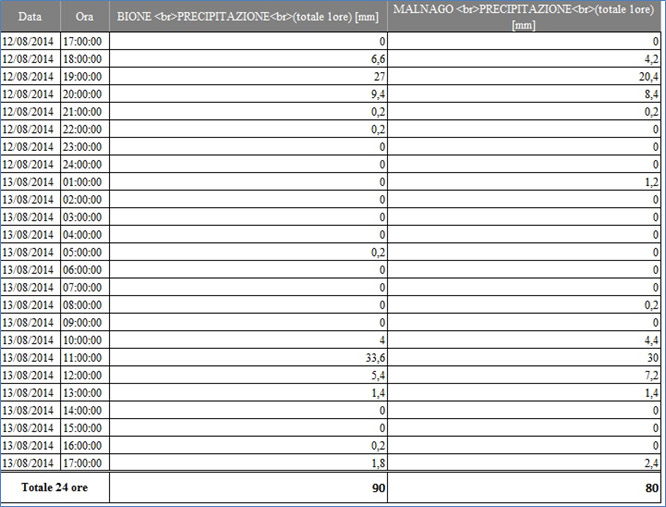 I giorni peggiori sono stati quelli del 29 giugno (75 mm di precipitazioni registrati dalla centralina del Bione e 61,8 mm da quella di Malnago), l’8 luglio (42,8 mm al Bione e 34,2 mm a Malnago), il 26 luglio (44 mm al Bione e 39,8 a Malnago) e le giornate dei veri e propri nubifragi di agosto ovvero domenica 10 (con 54,2 mm caduti in zona Bione e 34 mm a Malnago) nella notte in cui si è scatenata la tromba d’aria, martedì 12 e mercoledì 13 agosto (con valore massimo di 46,8 mm registrato a Malnago) e di Ferragosto (dove si sono toccati addirittura i 69,8 mm al Bione).