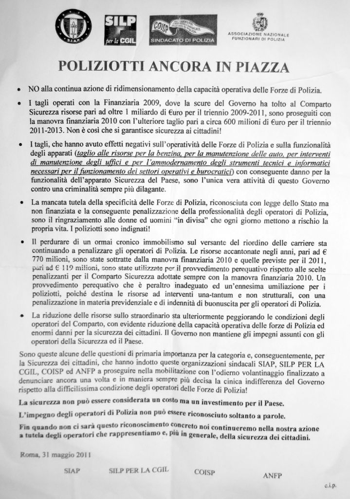 Pierluigi Danza segretario provinciale Siap di Lecco e Gaspare Liuzza della Coisp sottolineano: “Il timore più grosso è che tutto ciò che sta accadendo in questi ultimi anni passi per cosa normalissima da accettare senza battere ciglio. Ci riferiamo alla continua azione di ridimensionamento della capacità operativa delle Forze dell’Ordine, ai tagli effettuati con la finanziaria 2009 e quelli successivi con la manovra finanziaria del 2010. A fronte di quanto sta accadendo non possiamo permetterci di rimanere in silenzio. Ne va della nostra sicurezza e ancor più di quella dei cittadini”.