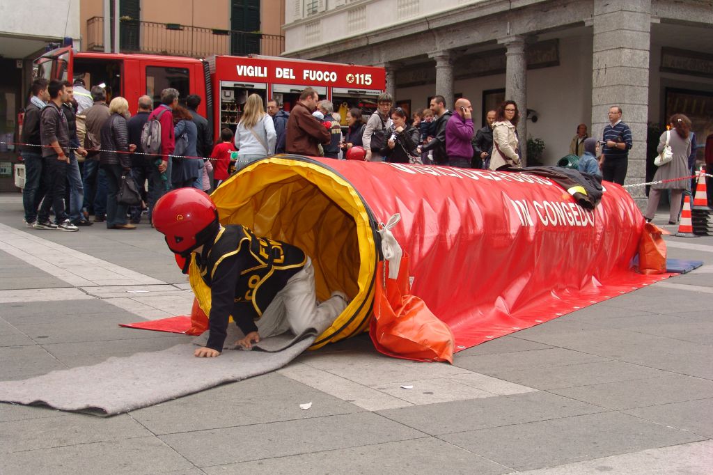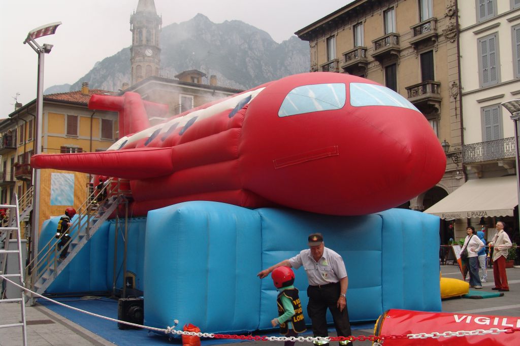 Molte le attrazioni per i bambini, che subito dopo aver indossato il caschetto protettivo, entravano in azione tuffandosi dal “classico” palo dei pompieri, per poi correre tra tubi e ostacoli; un grosso aeroplano (gonfiabile) in panne, necessitava l’aiuto dei piccoli eroi, che senza indugio si gettavano all’interno per poi tuffarsi di nuovo dagli scivoli d’emergenza.