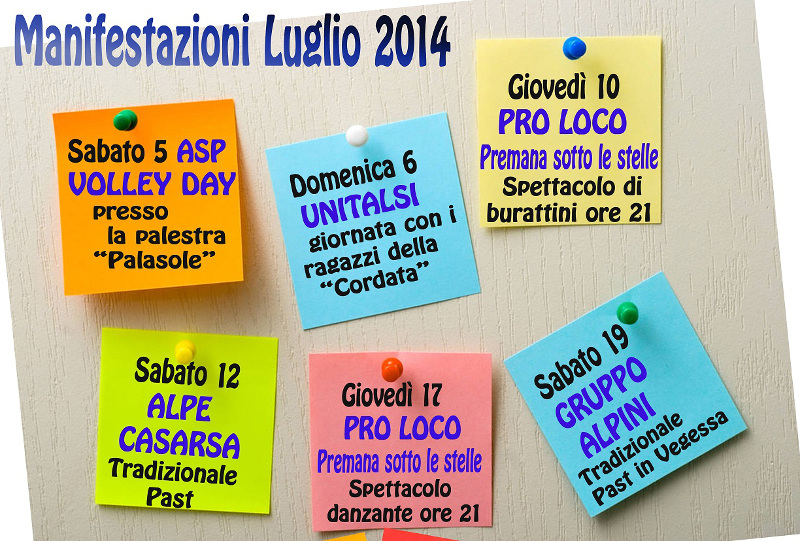 Da ricordare Premana Sotto le stelle, appuntamento fisso nei giovedì di luglio e ovviamente l’attesissimo Giir di Mont in programma per domenica 27 luglio. Va ricordato infine, anche se si tratta di un appuntamento autunnale, Premana Rivive l’Antico manifestazione biennale che si svolgerà sabato 11 e domenica 12 ottobre (www.premanarivivelantico.it).