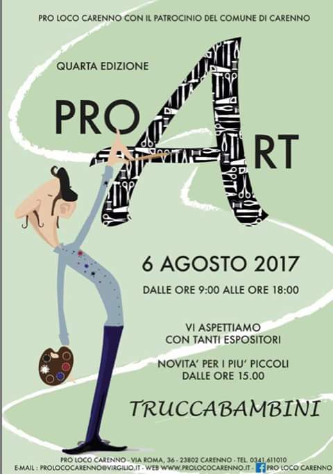 CARENNO – “Pro Art” è giunta alla quarta edizione: i mercatini di hobbistica, arti manuali e creatività locale tornano a Carenno in piazza Carale il 6 agosto dalle 9 alle 18, mentre dalle 15 il divertimento per i più piccoli sarà garantito dal “Truccabimbi“.