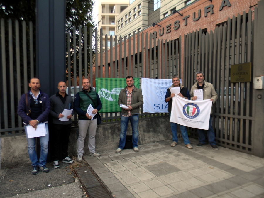 LECCO – Sit-In di protesta e distribuzione di volantini da parte dei rappresentati delle sigle sindacali della Polizia di Stato Coisp e Siap che si sono ritrovati prima davanti alla Questura di Lecco in corso Promessi Sposi per poi trasferirsi in via Leonardo da Vinci dove si trava l’Ufficio Immigrazione.