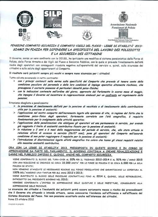Contro la legge di stabilità 2013, predisposta in questi giorni e in corso di approvazione da parte del parlamento, con cui il Governo continua a creare penalizzazioni e danni ai lavoratori pubblici e al Comparto Sicurezza, avendo confermato il blocco del turn-over al 20% per il triennio 2012-2014 e al 50% per l’anno 2015 con una riduzione degli organici di ben oltre 18.000 unità per le forze di polizia , circa 6.000 per la sola polizia di stato e altrettante per la polizia penitenziaria;