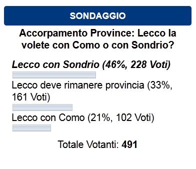 I risultati non lasciano dubbi. Dati alla mano, su 491 votanti, 228 persone, ovvero il 46%, si sono dette favorevoli a un accorpamento con Sondrio. L’idea di unirsi ai valtellinesi piace, forse per via di quella vocazione più montanara che lacustre da sempre riconosiuta ai lecchesi che li spinge ad avere più affezione verso Sondrio che non verso Como.