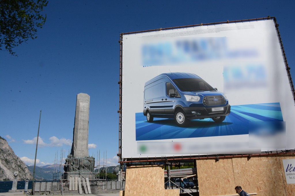 Uno dei manifesti pubblicitari installati sul lungolago di fronte al monumento ai caduti