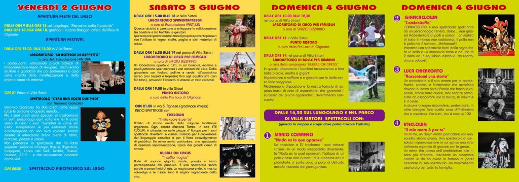 Il festival aprirà venerdì 2 giugno: per tutto il giorno dalle 9 alle 18 sul lungolago si terrà il “Mercatino della Creatività” mentre in zona Balugani ci saranno i gonfiabili offerti dall’Avis di Olginate.