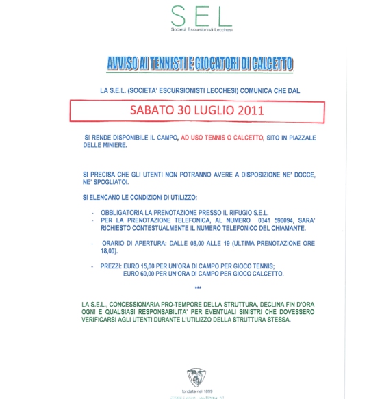 Di scettici ce ne sono stati parecchi: “Tanto quel campo lì non lo aprono”, dicevano scuotendo la testa. E invece, ecco la comunicazione giunta proprio in queste ore direttamente dal presidente della Comunità Montana del Lario Orientale Valle San Martino, Gianni Codega: il campo da tennis e calcetto dei Resinelli, da sabato 30 luglio, si potrà utilizzare chiedendolo al gestore del rifugio Sel Rocca Locatelli che sta a fianco dell’impianto sportivo.