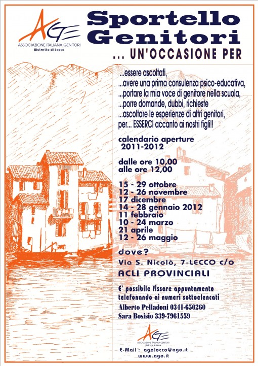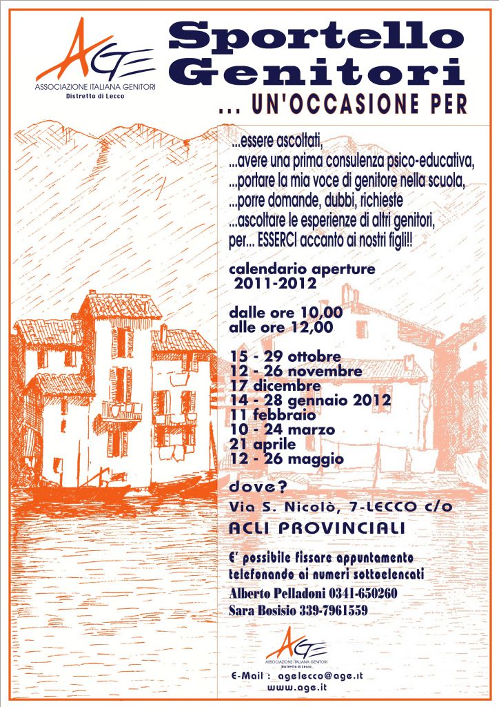 Sabato 14 gennaio dopo la pausa natalizia ha riaperto lo Sportello Genitori A.Ge. L’A.Ge Associazione Genitori del Distretto di Lecco mette a disposizione ormai da molti anni uno spazio di “Informazione Genitori” che prevede l’apertura di uno sportello di consulenza sul rapporto scuola-famiglia e non solo.