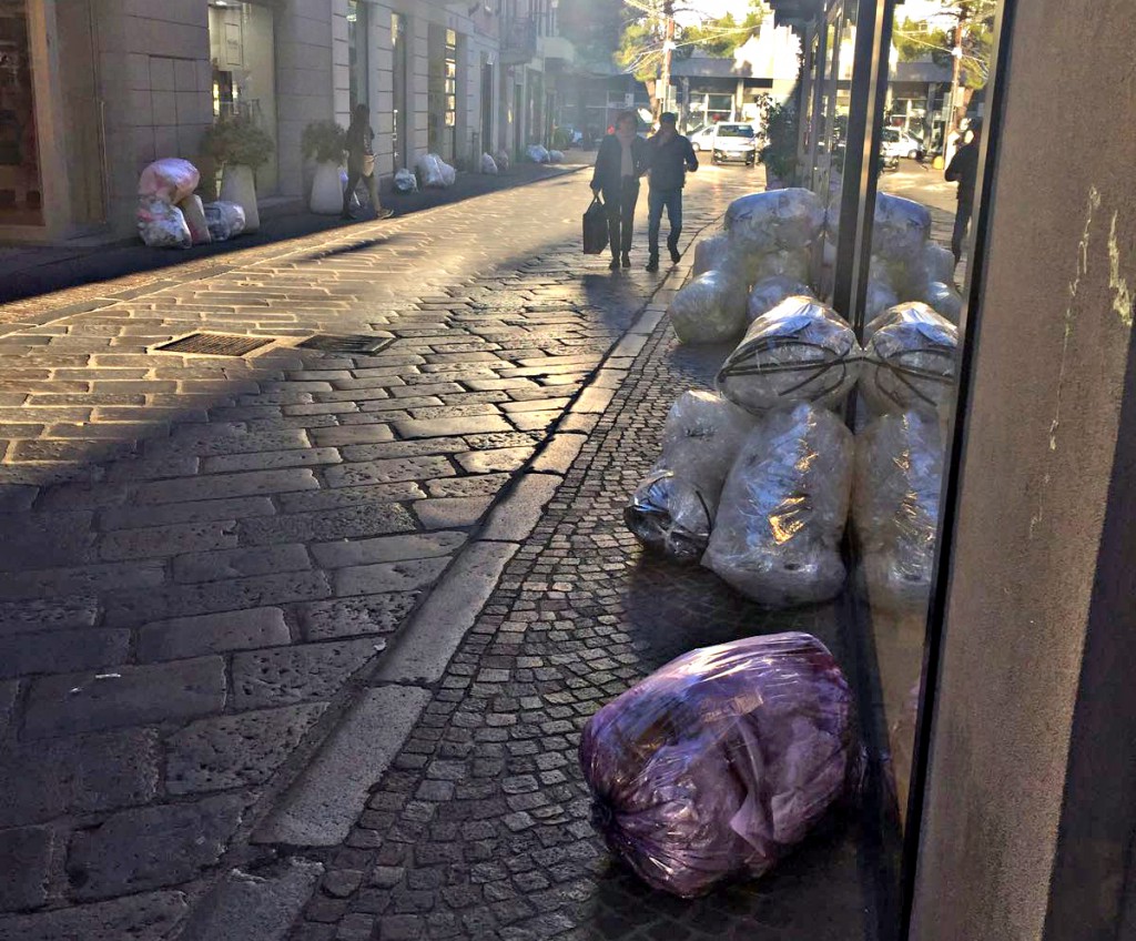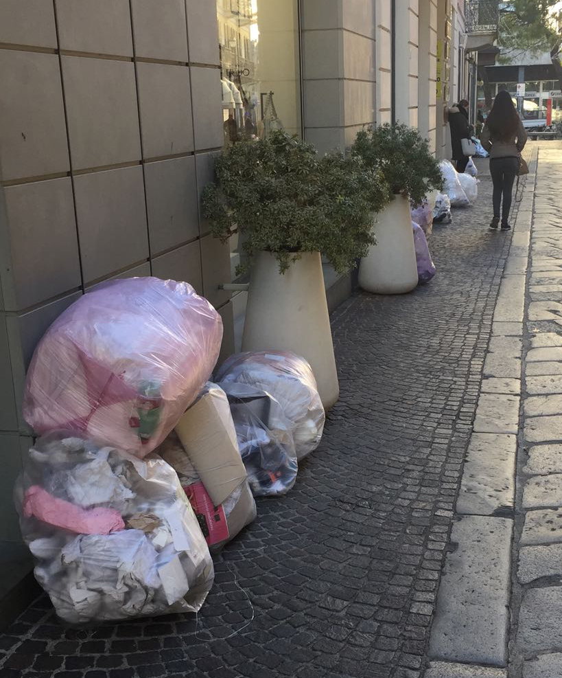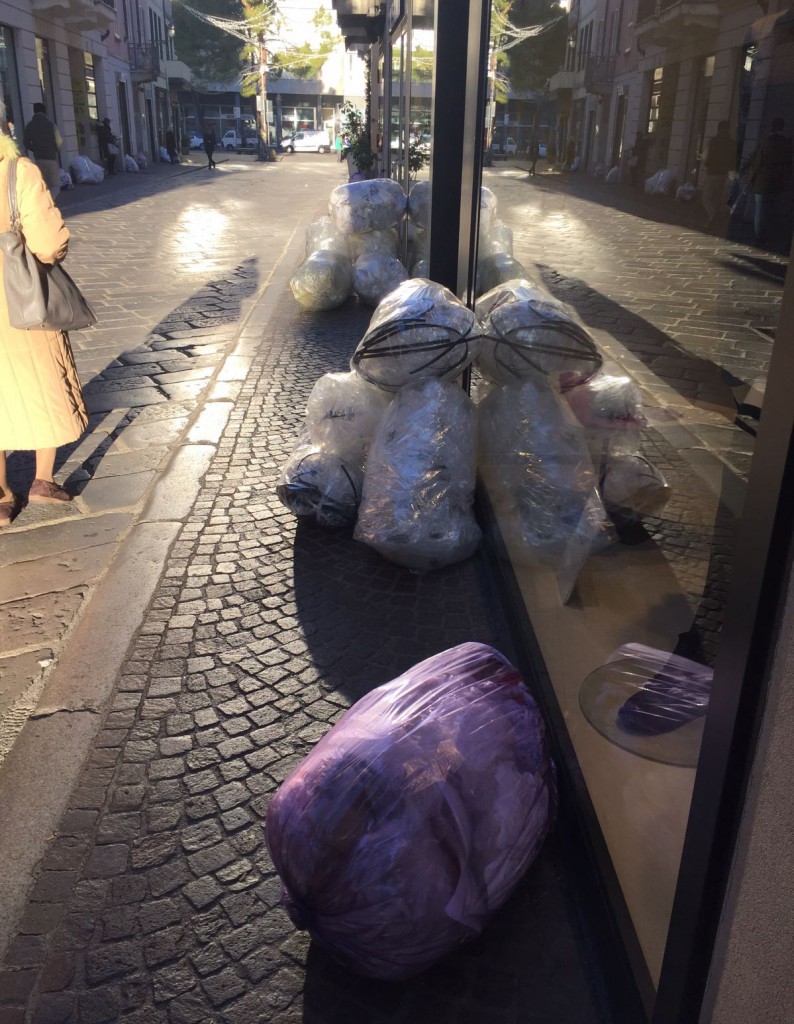 LECCO – Passeggiando per il centro tra le vetrine natalizie e i rifiuti: così, questa mattina, i passanti hanno trovato le vie del capoluogo ‘addobbate’ dai sacchi, viola e trasparenti, ad adornare gli angoli delle strade.