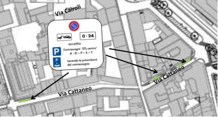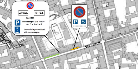 istituzione, lungo il lato destro dei tratti compresi tra il varco di accesso alla ZTL e il civico 2 , tra il civico 6 e l’intersezione con via Roma e tra la galleria pedonale del civico 42 e l’intersezione con via Cairoli, del divieto di sosta permanente con rimozione forzata ad eccezione dei veicoli muniti di contrassegno modelli A-D-P-S-T, la cui sosta sarà consentita per il periodo massimo indicato nel singolo titolo autorizzativo con l’obbligo di esporre in modo chiaro e ben visibile l’orario di inizio sosta, nella parte anteriore del veicolo;