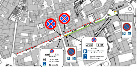 istituzione, lungo il lato destro del tratto compreso tra il civico 12 e l’intersezione con via Cavour, del divieto di sosta permanente con rimozione forzata ad eccezione dei veicoli muniti di contrassegno modelli A-D-P-S-T, la cui sosta sarà consentita per il periodo massimo indicato nel singolo titolo autorizzativo con l’obbligo di esporre in modo chiaro e ben visibile l’orario di inizio sosta, nella parte anteriore del veicolo;