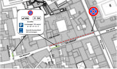 istituzione, lungo il lato destro del tratto compreso tra il varco della Ztl e l’intersezione con piazza Garibaldi, del divieto di sosta permanente con rimozione forzata ad eccezione dei veicoli muniti di contrassegno modelli A-D-P-S-T, la cui sosta sarà consentita per il periodo massimo indicato nel singolo titolo autorizzativo con l’obbligo di esporre in modo chiaro e ben visibile l’orario di inizio sosta, nella parte anteriore del veicolo;