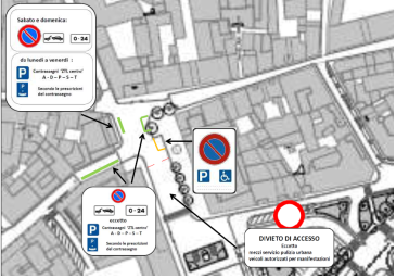istituzione, lungo il lato destro in adiacenza alla chiesa, del divieto di sosta permanente con rimozione forzata ad eccezione dei veicoli muniti di contrassegno modelli A-D-P-S-T, la cui sosta sarà consentita per il periodo massimo indicato nel singolo titolo autorizzativo con l’obbligo di esporre in modo chiaro e ben visibile l’orario di inizio sosta, nella parte anteriore del veicolo;