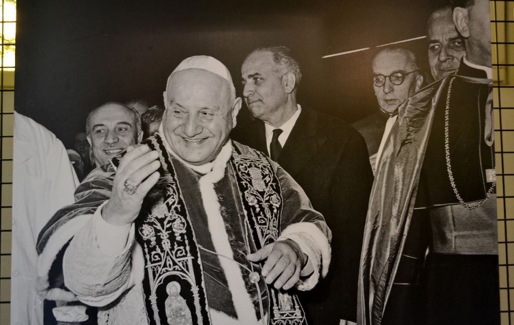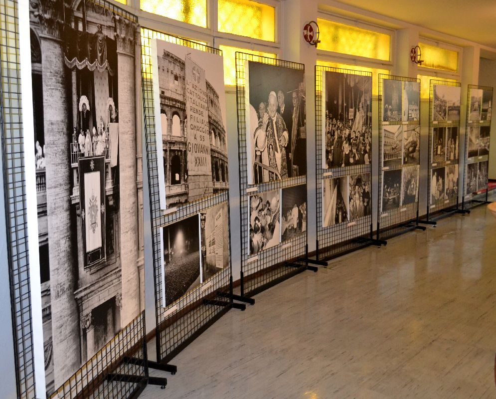 La mostra è articolata in due sezioni. La prima raccoglie le foto, in bianco e nero, relative al pontificato di Giovanni XXIII. E’ così possibile ammirare il “Papa buono” mentre benedice le folle e visita i malati dell’Ospedale pediatrico “Bambino Gesù”, così come quelle che lo ritraggono impegnato nei lavori di apertura del Concilio Vaticano II.