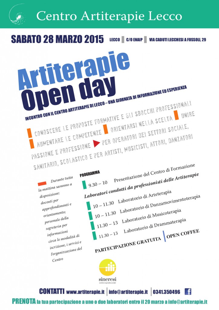 LECCO – Sabato 28, presso l’istituto Enaip – via Caduti Lecchese a Fossoli, 29 – Lecco, si terrà la prima edizione dell’open day del centro Artiterapie di Lecco. Il Centro Artiterapie, storica realtà del settore formazione della cooperativa sociale La linea dell’arco, ora Sineresi*, finalizza le proprie attività alla formazione nelle arti terapie (Arteterapia, Danzamovimentoterapia, Drammaterapia e Musicoterapia), alla loro diffusione e all’accompagnamento del professionista delle arti terapie nel suo percorso professionale.