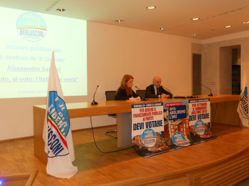LECCO – Dopo il rinvio di settimana scorsa a causa delle nevicate che hanno interessato anche Lecco, si è svolto presso la Sala conferenze di Palazzo Falk l’incontro, organizzato dal commissario provinciale del Pdl ed ex ministro del turismo Michela Vittoria Brambilla, con il giornalista e direttore de “Il Giornale” Alessandro Sallusti, che ha affrontato diversi temi legati all’attualità politica e non solo.