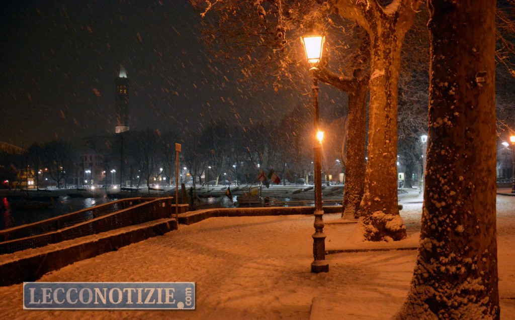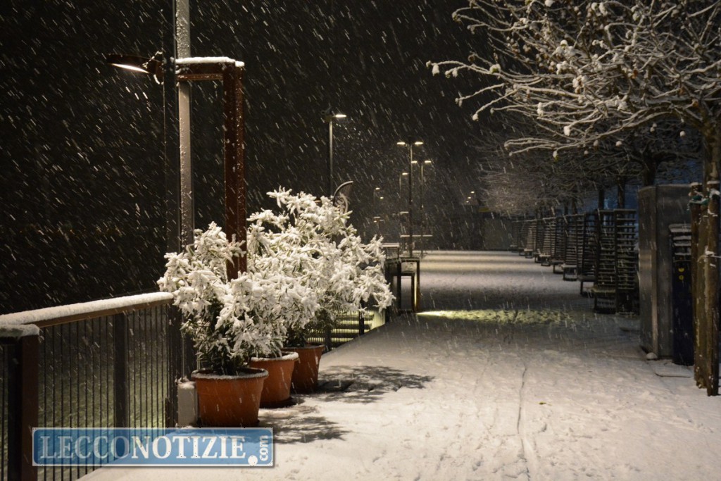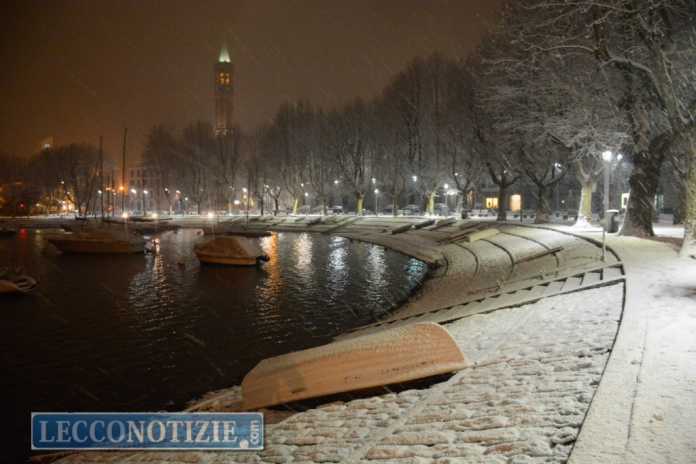 Il lungolago di Lecco imbiancato dalla nevicata, la foto scattata in tarda serata