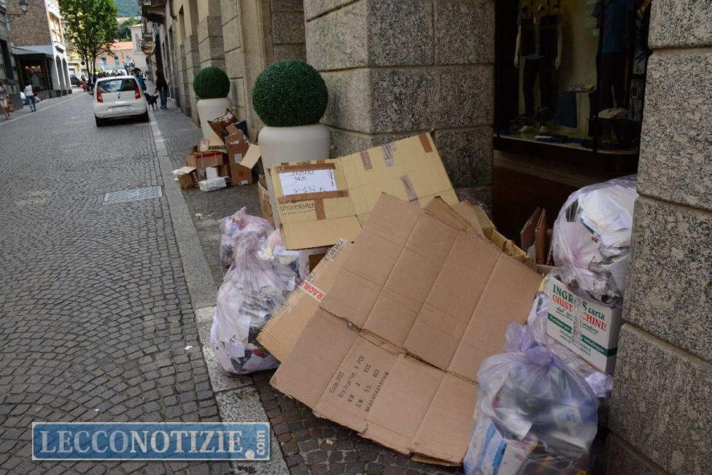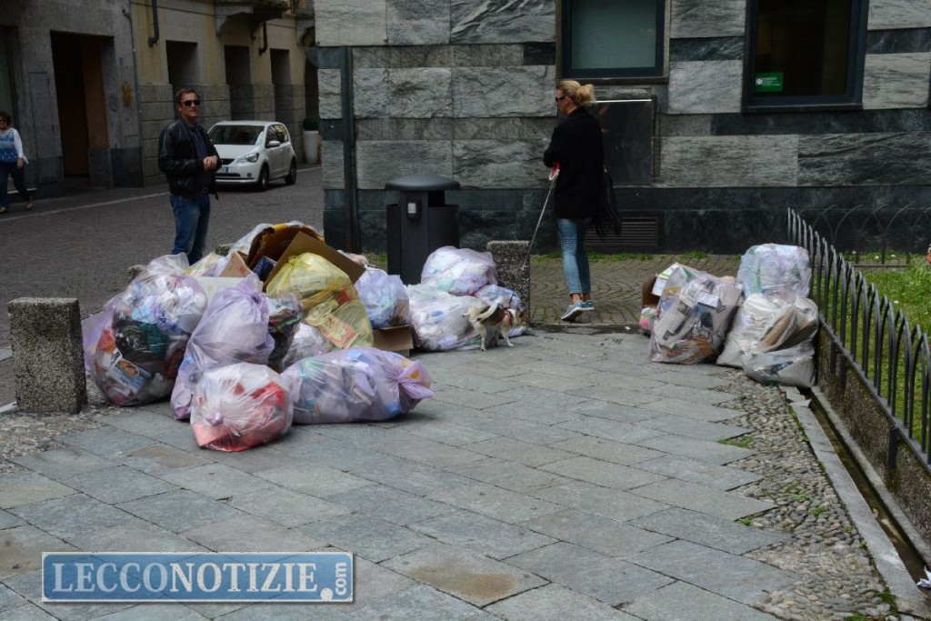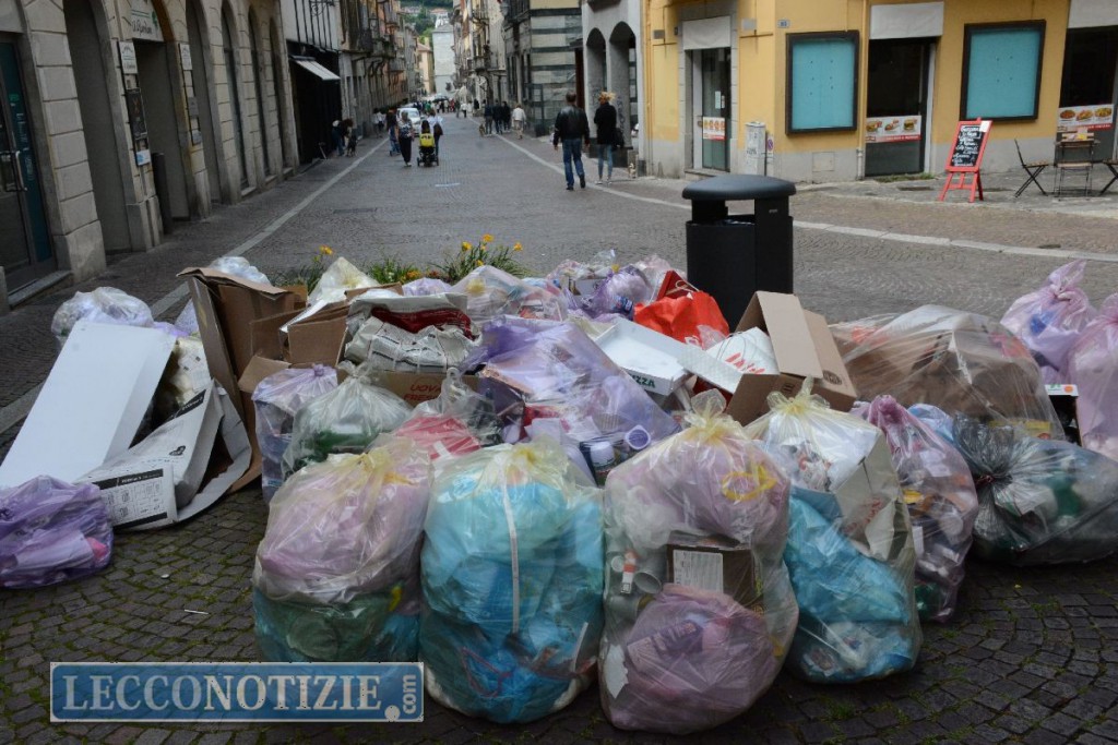 LECCO – Spazzatura ovunque, nelle aiuole, accanto ai cestini, agli angoli delle strade e pure davanti alle vetrine delle attività commerciali: così si presentava il centro storico di Lecco mercoledì mattina, nel giorno dello sciopero  nazionale degli operatori della raccolta dei rifiuti.