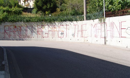 “Rancio against the machine” hanno scritto gli ignoti sulla parete, rifacendosi al nome della band statunitense Rage against the machine: rabbia contro la macchina, o meglio contro il sistema. Un incitamento diretto al rione che non sembra essere stato molto apprezzato dai residenti, a giudicare dai commenti poco lusinghieri rivolti agli sconosciuti autori.