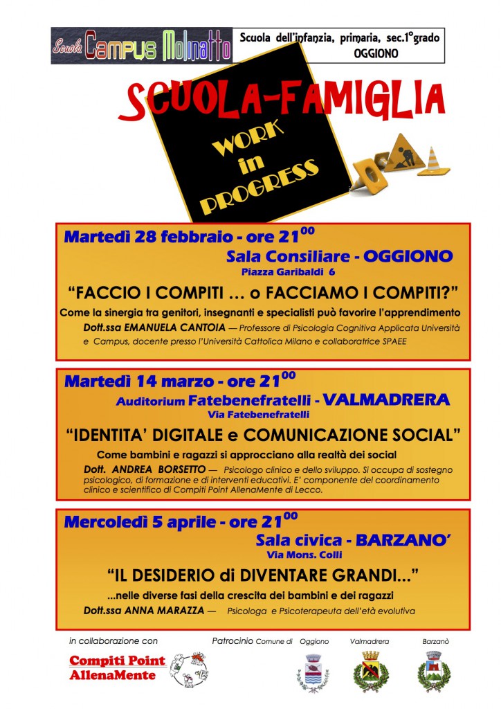 OGGIONO – Un ciclo di appuntamenti intitolati “Scuola-famiglia work in progress” dedicato a tutte le famiglie del territorio con bambini alla scuola dell’infanzia, alla primaria oppure alla scuola secondaria di primo grado.