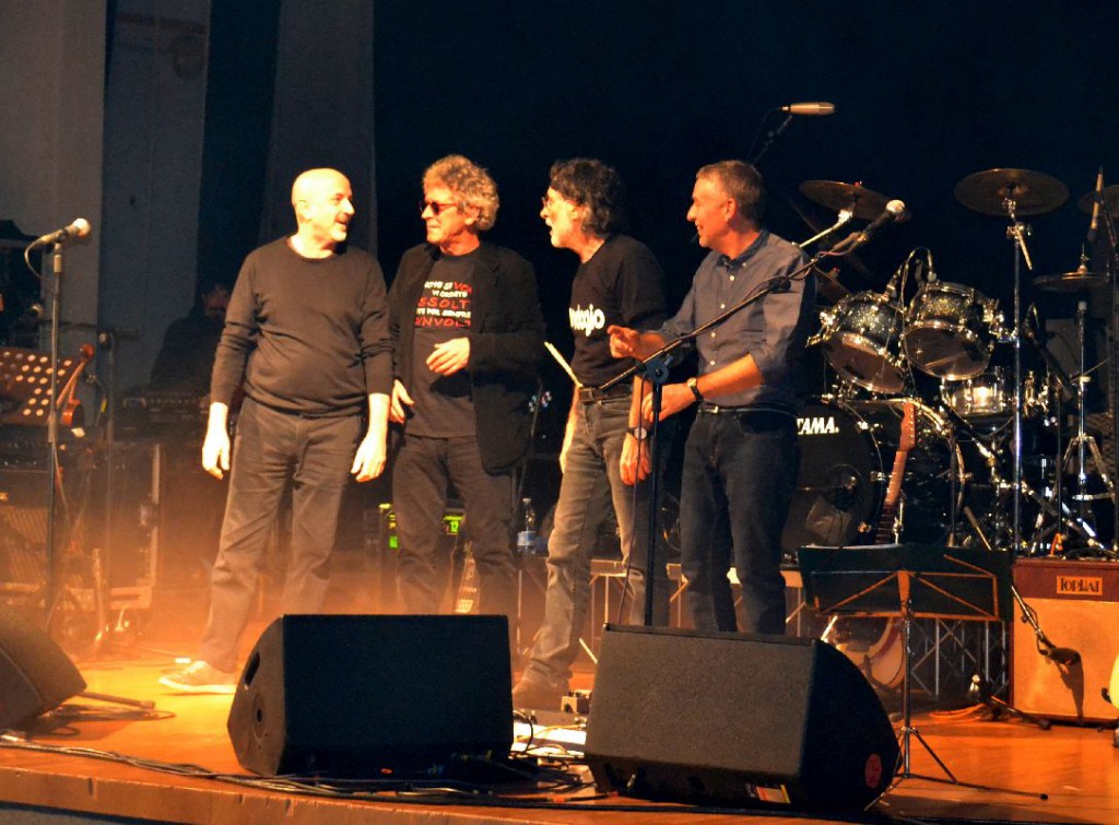 Da sinistra Lucio Fabbri, Reinhold Kohl, Franz Di Cioccio e Paolo Bonfanti sul palco del “De Andrè”.