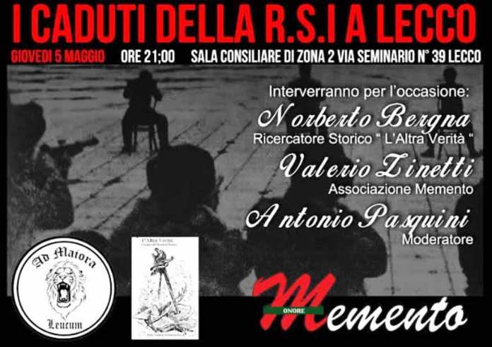 Un appuntamento dal titolo “I caduti della Repubblica Sociale Italiana a Lecco” che vedrà ospite Norberto Bergna, ricercatore e tra i fondatori del Gruppo di Ricerca Storica L’Altra verità, oltre ad essere referente del Comitato Nazionale Ricerche ed Onoranze ai Caduti della Repubblica Sociale Italiana.